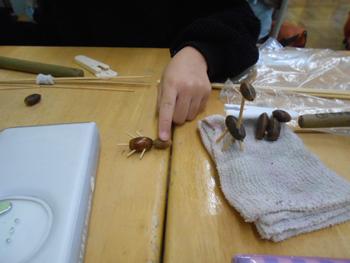 1年生の子どもたちは、公園に出かけては秋を感じてきたり、どんぐりを集めたり、季節を満喫しています。今日は集めてきたどんぐりやはっぱを使ってどうぶつやコマを作ったり、遊びを考えて遊んだりしていました。遊び方や説明の仕方も自分たちで考えながら工夫をしていました。楽しくできることばかりではなくて、「なんかうまくいかないな」とふと立ち止まったり考えたりする場面があってよい学びになっていました。