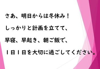 本校では振替の関係で今日が冬休み前の最終日となりました。冬休みは年末年始もあり一つの節目となるタイミングです。2025年のよい締めくくりをして、2026年のよいスタートがきれることを願っています。