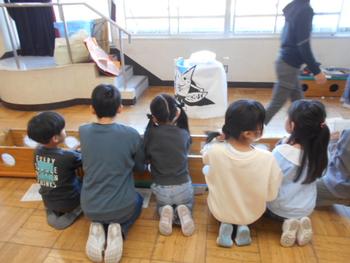 表彰式後、「マリノスケ」には近くの教室を覗いてもらいましたが、子どもたちは突然のキャラクターの登場に大喜びでした。