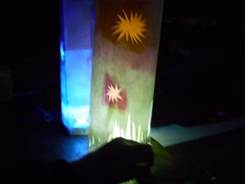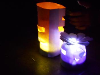 図工室の暗幕が閉められていたので覗いてみると、5年生が作品「紙から生まれるすてきな明かり」の鑑賞をしていました。暗くしたときの明かりのきれいな感じに声が子どもたちから上がっていました。