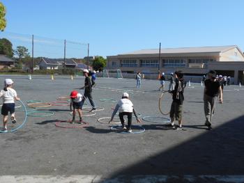 1年生の朝の「るんるんタイム」は、校庭での活動も始まりました。今日は6年生も一緒に校庭に出て、一緒に遊びながら時間を過ごしました。