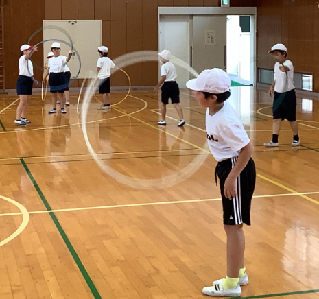 フラフープを自由に扱えるようになりたいと、教え合い取り組んでいるところです。