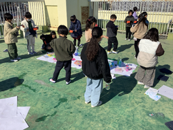 今日は、特別な学習の場。屋上です。とてもよい天気。たっぷりの太陽の光の下で、インクを水に混ぜると、キラキラ光るアイテムの出来上がりです。