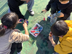 太陽にあてると、それぞれの光が広がり、色のコラボレーションが生まれました。もうみんな夢中です。太陽にかざしたペットボトルに負けないぐらい、一人ひとりの表情が光っていました。あったかい日の光からプレゼントをもらい、子どもたちは喜んでいました。