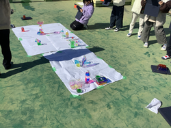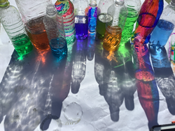 「すごい。」「きれいに色がうつっている。」「色が重なっているところがあるよ」透明な水に色がつく様子に驚く子。ペットボトルの置き方や角度を工夫する子。
