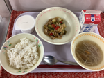 ごはん・牛乳・あじのピリ辛ソース・ゆで野菜・中華スープ
