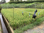 外田んぼに実ったお米を食べられないように、5年生がCDやかかしなどを田んぼに取り付け、すずめを追い払う対策を考え、取り付けました。