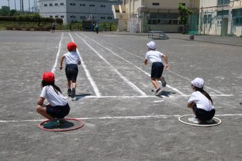 4年生の体育学習ではリレーのバトンパスの練習をグループごとに行っていました。