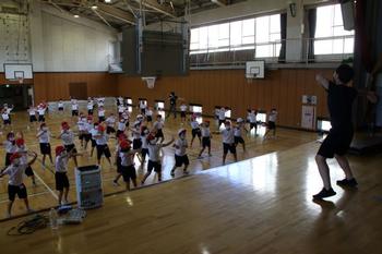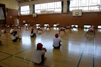 5年生と6年生の体育学習の様子です。5年生は校庭で座った状態から向きを変えてダッシュする運動をしていました。6年生は体育館で手を直接つなぐかわりに教師自作教材「手つなぎ最強アイテム」を使って輪になって運動を楽しみました。両学年とも笑顔いっぱいでした。