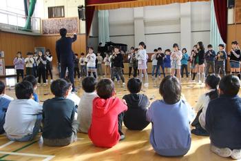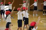 多目的室では1年生が音楽「おんがくにあわせてあるこう」の学習をしていました。音楽に合わせて楽しく動いていました。
