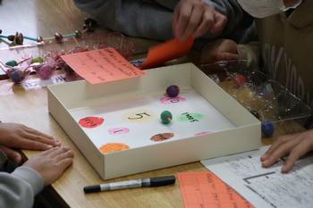 今日は時折激しく雨が降る時間もありましたが、春を感じさせる気温でした。2年生の図工は紙版画。図工室で刷っている場面を見ることができました。