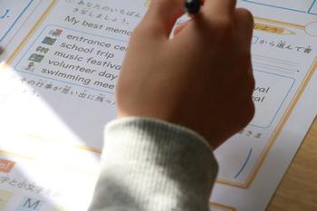 1年生はひらがなの学習中。指でドリルの字をなぞった後、鉛筆を使って練習していました。