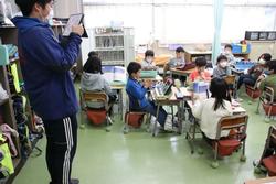 1年生は黒板に教科書の絵を掲示しての学習。手をたくさん上げていました。
