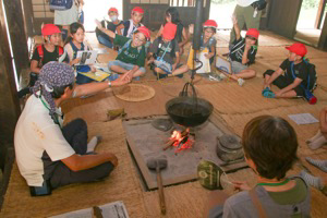 古民家を維持するため、夏でも囲炉裏で火をおこしていました。床に上がり囲炉裏にあたって、ボランティアの方とお話をしながら、学びをより深めることができました。
