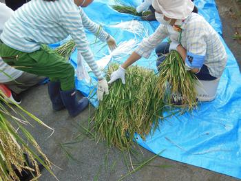 5年生の子どもたちが脱穀体験をしました。当日は保護者の皆様のご協力で時間内に終わることができました。
