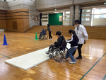 25日に神奈川運輸支局の方が来てくださり、体育館で車いす体験と視覚障碍者誘導体験が行われました。