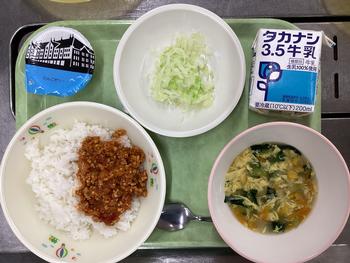 給食ではトマト味で、少しスパイシーな味付けのタコミートと茹でたキャベツをごはんの上にのせて食べました。