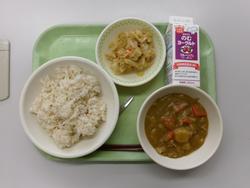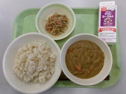 はいがごはん・ポークカレー・ごま酢あえ・プルーンはっこう乳