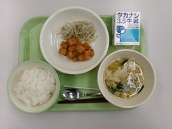 ごはん・牛乳・白身魚のチリソース・ゆで野菜・ワンタン風スープ