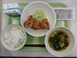ごはん・牛乳・ 鶏肉のたつた揚げ・ボイルドキャベツ・ すまし汁・40周年お祝い焼きのり