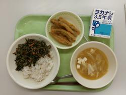 むぎごはん・牛乳・栄養満点丼の具・きびなごフライ・みそ汁 です。