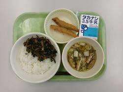 ごはん・牛乳・ひじきごはんの具・ししゃもフライ・けんちん汁