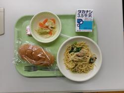 ぶどうパン・牛乳・ツナとこまつなのスパゲティ・ホットマリネ・チーズ