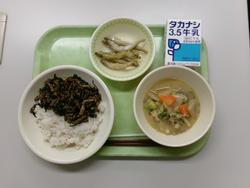 むぎごはん・牛乳・ひじきごはんの具・魚のから揚げ・呉汁