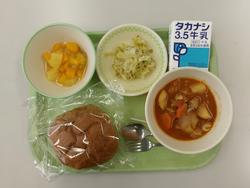 はいがパン・牛乳・鶏肉のトマトシチュー・キャベツサラダ・ミックスフルーツ