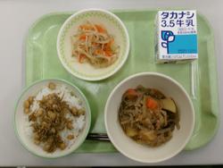 ごはん・牛乳・肉じゃが・からしじょうゆあえ・だいずとじゃこの炒り煮