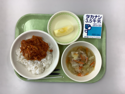 むぎごはん・牛乳・チキンライスの具・野菜スープ・りんご