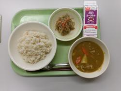 はいがごはん・ポークカレー・ごま酢あえ・プルーンはっこう乳