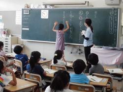 1年生の国語の学習の様子です。「助詞」の使い方を学習していました。わにはかわからかおをだした。「わ」を使うのか「は」を使うのか?場面に合わせて、どれが正しいのかみんなで楽しく考えることができました。
