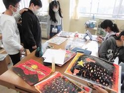 5年生の図工の学習の様子です。版画を行っていました。彫っては刷り、彫って刷りのくり返しをすることで複数の色が重なり、きれいな作品に仕上がっています。それぞれ味のある素敵な出来ばえでした!