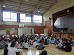 全校児童が体育館に集まり、学校の歴史に関するお話やクイズを楽しみました。