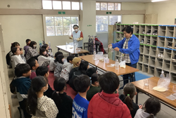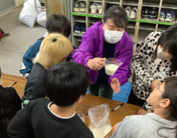 11月25日、地域防災拠点の委員の方々の協力のもと、災害時炊飯体験をしました。専用の袋に入った無洗米に水や野菜ジュース、コーヒーなどを入れ、袋の口をゴムでしっかり結び、湯を沸かした大きな鍋に入れて茹でると、ご飯が炊けました。災害が起こった時に、たくさんの人のサポートのもと、様々な工夫をして大切な命を守っていくことが分かりました。