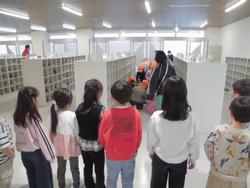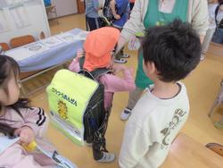 さらに、1年生体験として、ランドセルを背負ってみたり、1年生の教科書を一緒に読んだりする活動も行いました。「ちょっと重いね」「はやく1年生になりたい」など、園児たちの明るい声が教室に響き、笑顔あふれる交流となりました。