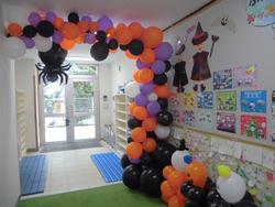 10月の終わりを迎え、キッズクラブの入口が楽しいハロウィンの飾りで彩られています。