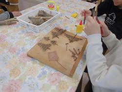 4年生の総合的な学習の時間「リサイクル活動」4年生は総合的な学習の時間に、環境やリサイクルについて学んでいます。今回は、旧校舎で伐採された樹木を活用し、昇降口に飾るウェルカムボードの装飾づくりに取り組みました。