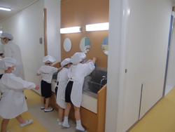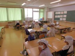 給食の時間を迎える前に、手洗い・うがいを丁寧に行い、エプロンや帽子、マスクを身につけて身支度を整えました。担任の話をよく聞きながら、一つ一つ確認する姿からは、「自分たちでやってみよう」という気持ちが伝わってきました。