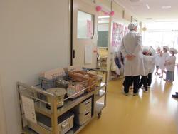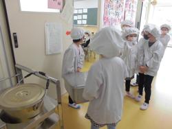 準備が整うと、廊下に置かれたワゴンから給食を受け取り、友だちと力を合わせて教室まで運びました。