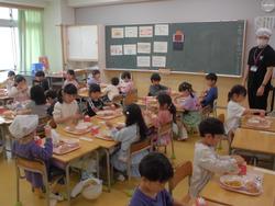 教室では、先生が配膳の見本を示し、そのあと子どもたち自身で配膳に挑戦しました。