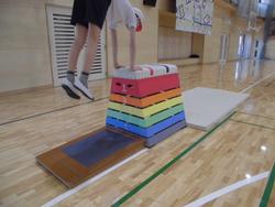 慣れの運動では、ふみきり板を強く踏み切り、腰を高く上げることを意識しながら、教師の見本をよく見て動きのイメージを膨らませていました。