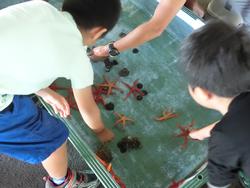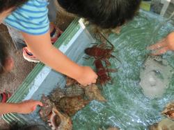 一般社団法人大日本水産会の方々に来ていただき、おさかな学習会を行いました。1年生から6年生まで、学年ごとにカツオの一本釣りや投網の疑似体験をしたり、三浦半島で水揚げされた魚介類に触れたり、漁師さんの仕事について学んだりしました。特に、タッチプールでの魚介類と触れ合う活動では、タコやイセエビ、サメなど普段の生活ではなかなか触れることができない海の生き物に生きたまま触れることができました。どの学年の児童も大喜びでした。