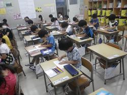 ヒマワリが行儀よく並んでいます。みんな同じ方向を向いていますね。「ヒマワリ」という名前の由来は、太陽の動きにつれてその後を追うように花が回ることからです。そして、完全に開いた花は東を向いているそうです。どおりで、キッズ前のヒマワリも、1年生の教室前のヒマワリも同じ方向を向いています。もう完全に花が開いたのですね。