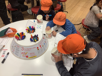 カップヌードルミュージアムでは、決めておいたイラストをカップの周りに丁寧に描いて、好きな具材を選び、それぞれの思いを込めたオリジナルのカップヌードルを作りました。