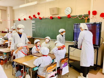 1年生の教室に6年生が来て、準備の仕方や並び方、配膳の仕方を優しく丁寧に教える姿が見られました。
