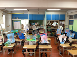 3~6年は図画工作科で「顔を入れたらなんだかわくわく!」を行いました。画用紙に穴を開け、周りに絵を描いてパネルを作りました。実際に顔を出して友達同士見合うと「それ、面白いね!」と声をかける場面が見られました。