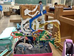 11月~12月の図工で、電動糸のこを使った立体作品を作成しました。刃の付け方や板を動かすスピードに慣れるまではおそるおそる触っていましたが、慣れてくると思い思いの形に切り進めていくことができました。下書きせずに自然にできた形を組み合わせていき、不思議な形を表現しました。最後は色をつけて完成です。