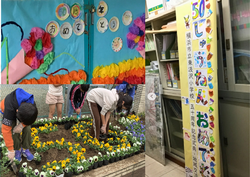 各学年でお祝いの飾りや式典の看板を作ったり、6年生の代表児童の「ひぐみハッピーチーム」が様々な準備をしたり、取り組みをすすめています。正門横の花壇には、お花で「50」の文字が!